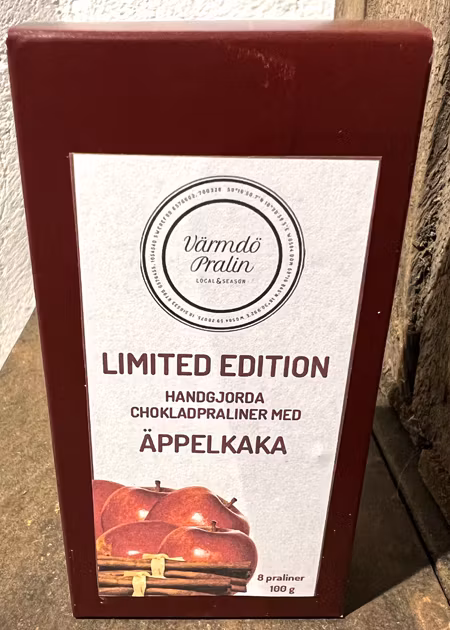 Pralinerna är fyllda med dels en kola som smaksatts med ekologiskt äpple och dels en kaneldoftande ganache gjord på mjölkchoklad.
