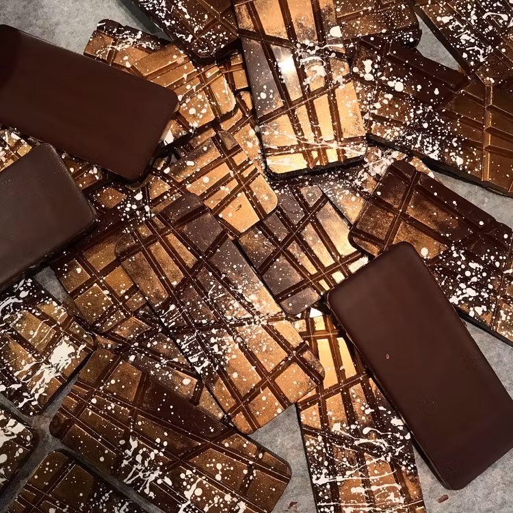 Handgjorda praliner med skal av ljus och mörk ekologisk fairtrade-choklad.